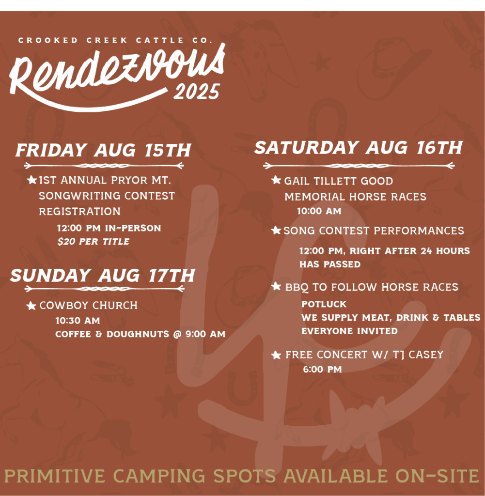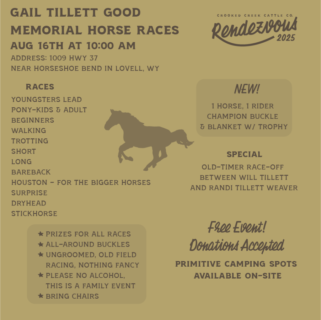 Join us on Sunday, August 17th, for Cowboy Church under the Wyoming big sky. The service will begin at 10:30 AM at the race location and will be led by ordained minister TJ Casey. It’s a simple time to gather, reflect, and share in faith together—everyone is welcome.